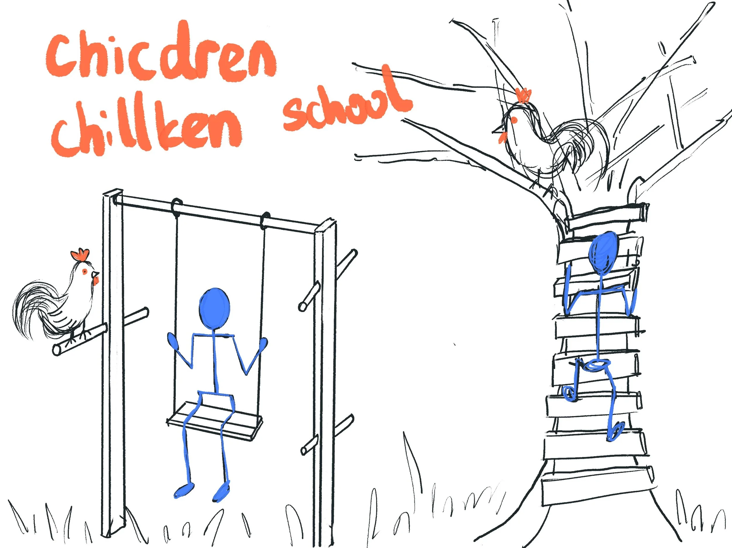 An imagined school where both chickens and children will go to school to learn and play together. A situation that pushes both species to think and take actions to create a uniform world.