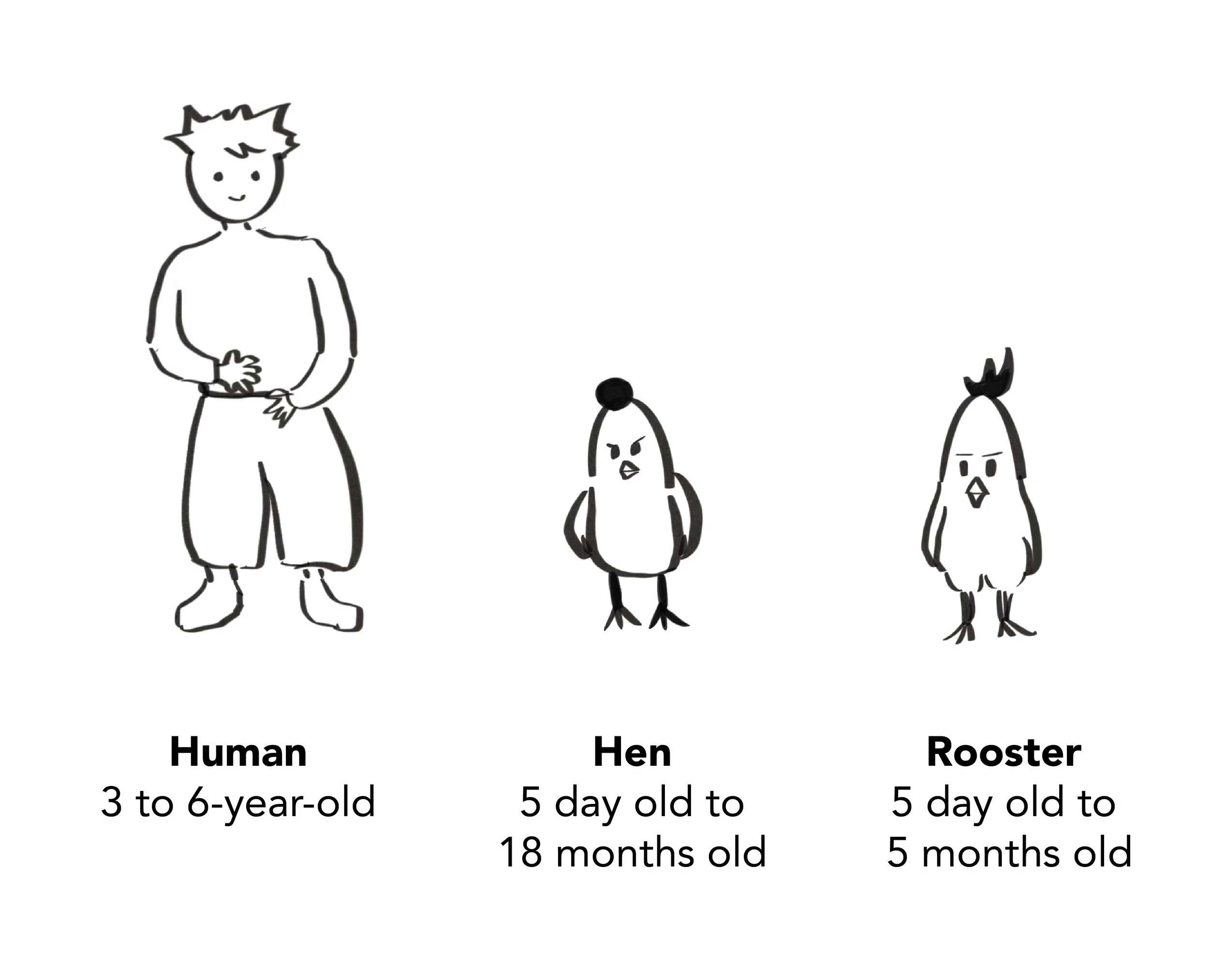 Currently the Chicken Human School only accepts children between 3-6 years old, between 5 to 547 days and cockerels between 5 to 168 days. While humans can only start to understand basic math at 3 year old, chicken can understand it 5 days after birth. Due to different development speeds of the two species, I have taken into consideration that hens will become mothers at the age 18 months while roosters will become fathers when they are 5 months old. To meet the standards of the life span of the chickens, specific chick’s will graduate after 5 months or 18 months old.